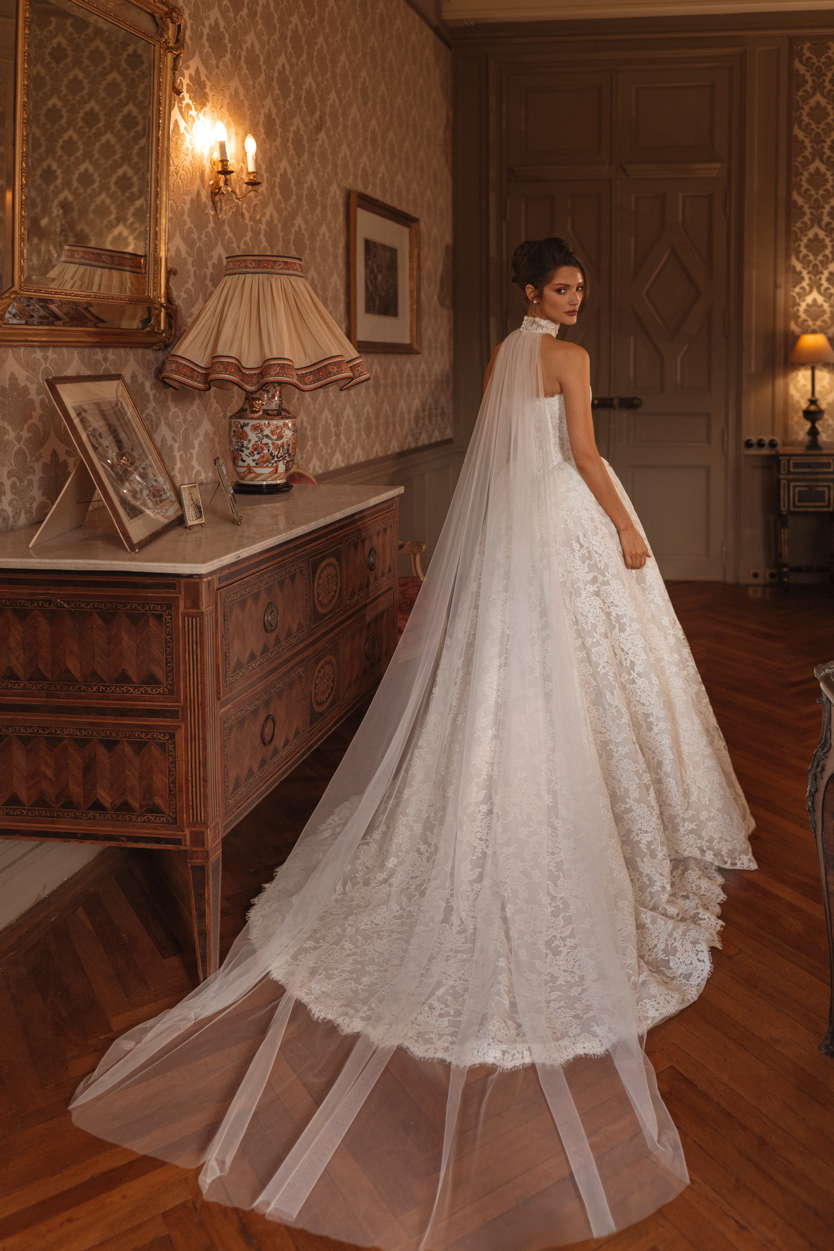 The Avel ball gown is made of Chantilly lace with floral patterns. The sweetheart bustier corset is adorned with scallops, a nude mesh insert that creates the illusion of recess, internal lacing, and a back zipper. The skirt is particularly noteworthy, with a cut inspired by the frame dresses of Renaissance Spain. It has a little secret: internal multi ‒ layered flounces that are attached to increase the volume on the sides. With their help, you can adjust the desired silhouette: from a smooth A-line, the skirt turns into a very fluffy one. This dress is perfect for a classic wedding with a slight vintage accent. It is easy to imagine it in an old chapel or castle.