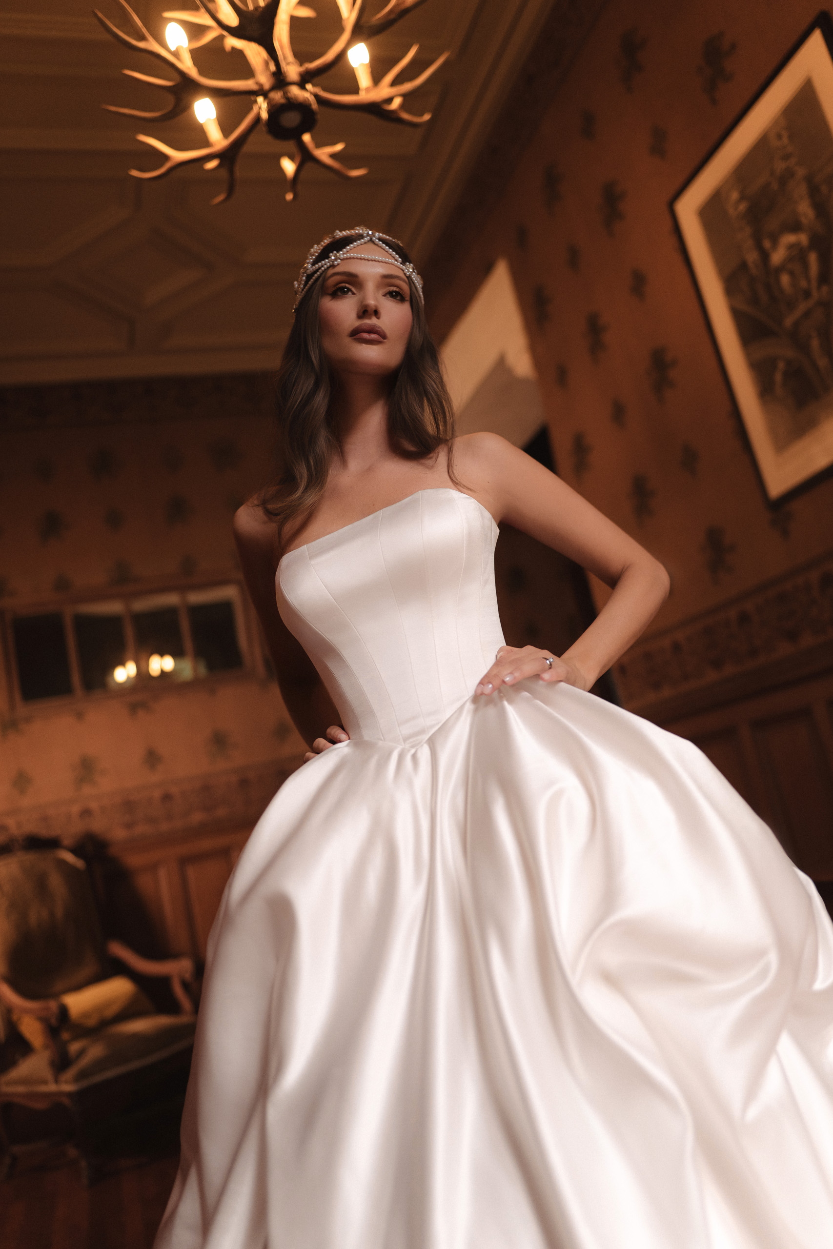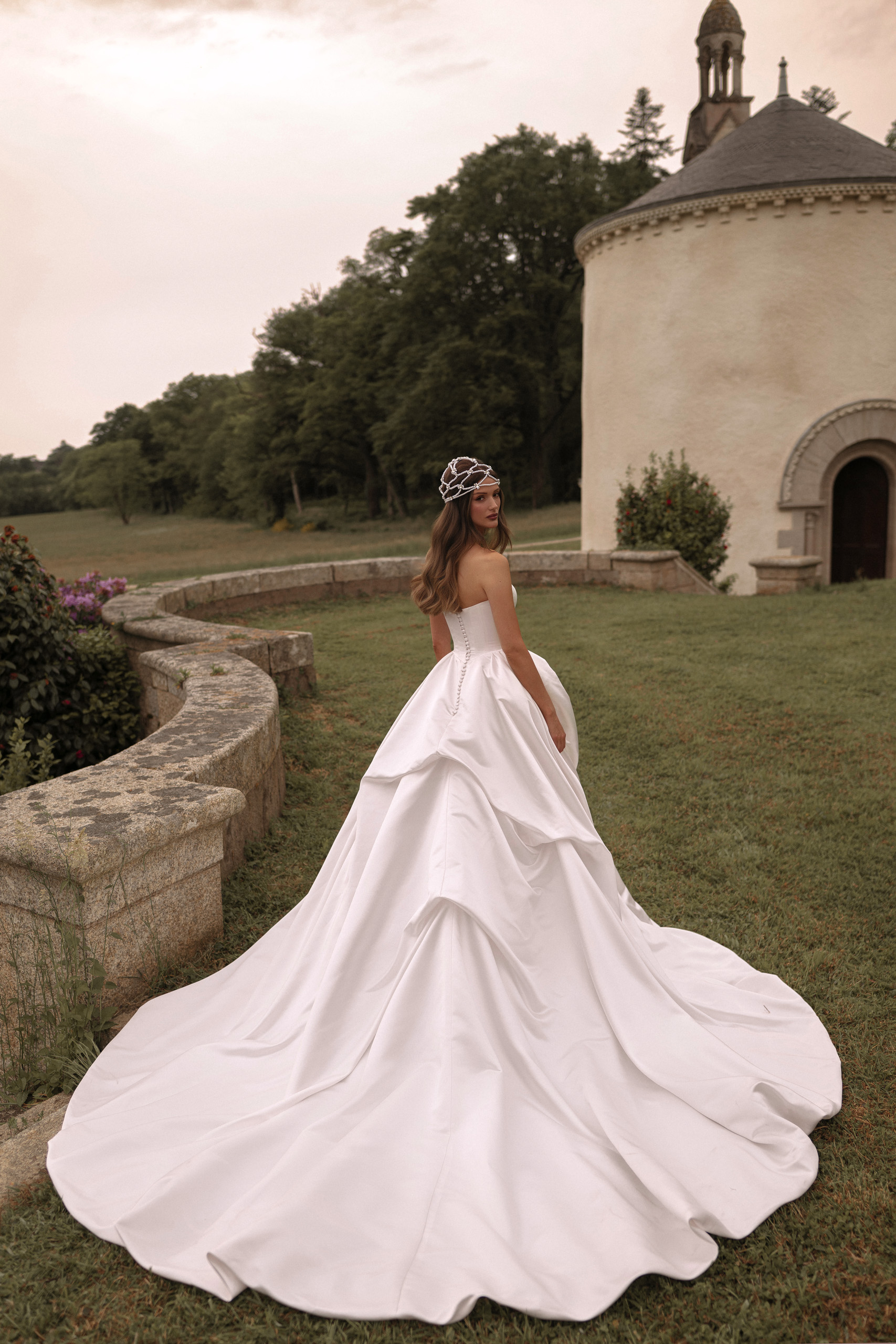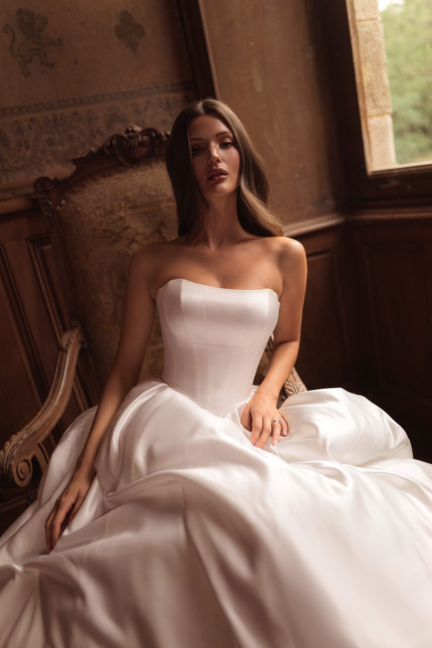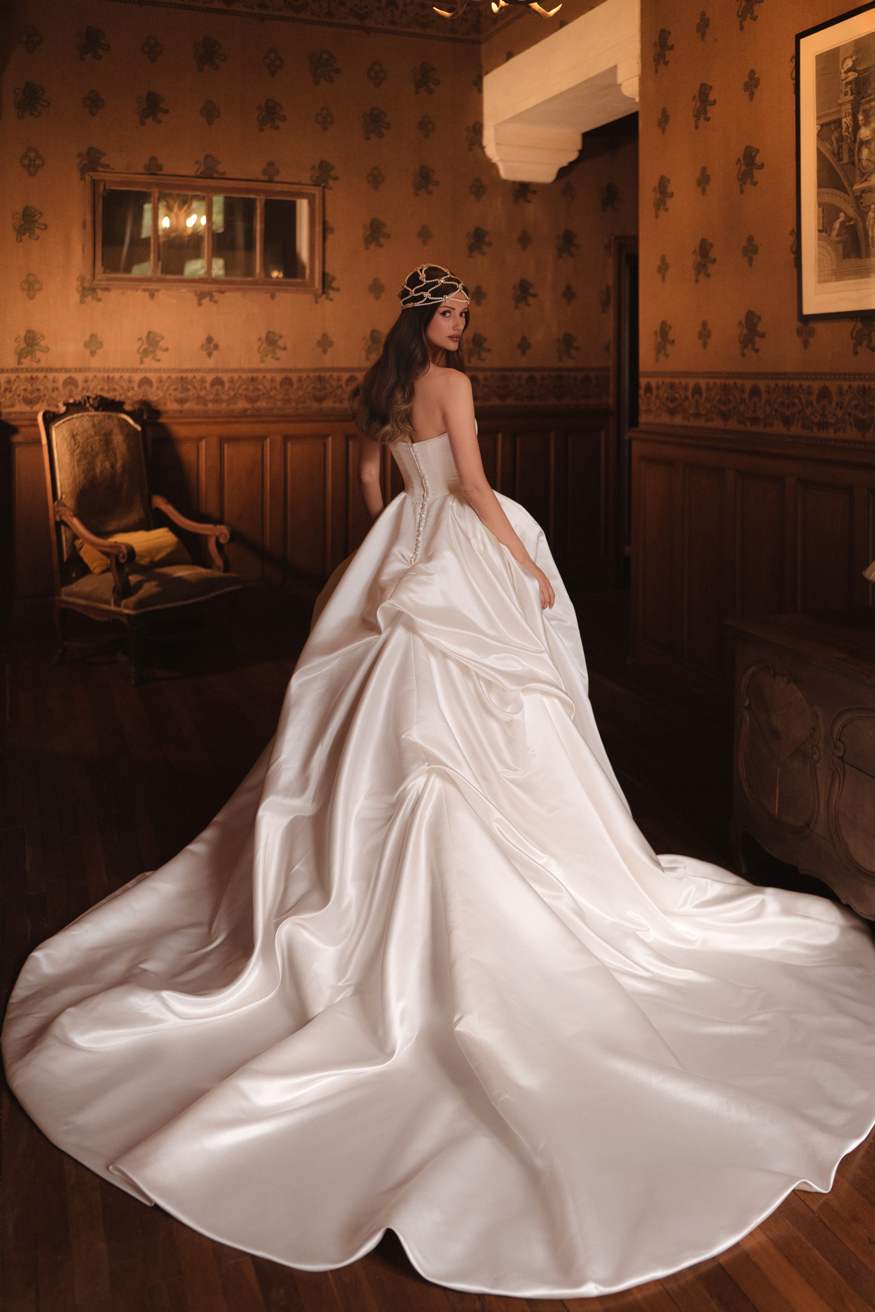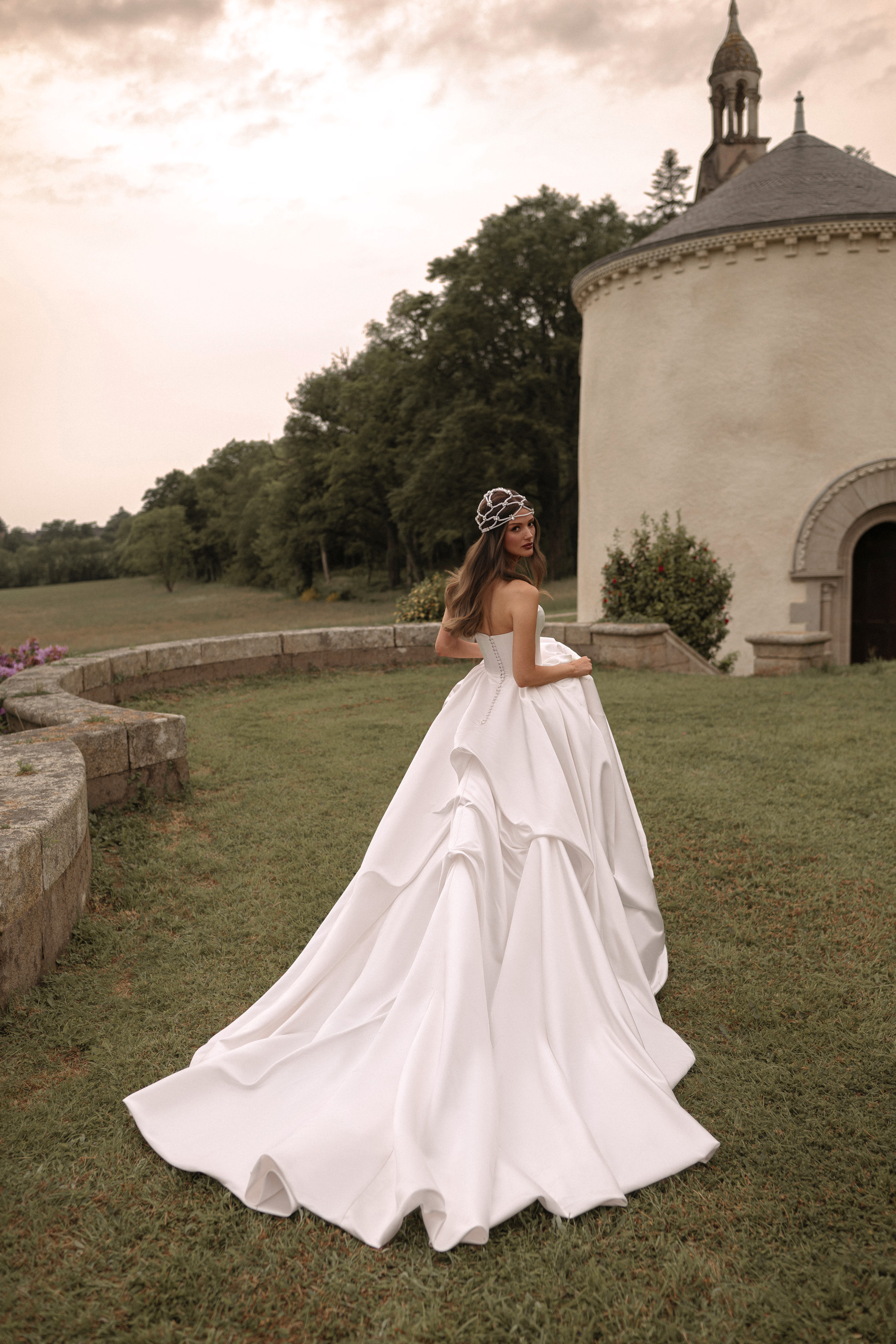 The Sharon dress is a modern interpretation of a classic ball gown for a bride who dreams of a royal look. The silhouette with a fluffy skirt adds majesty, and the perfectly designed corset with a graceful neckline emphasises the shoulder line. The basque waist gives the figure a special sculptural effect, creating an elongated silhouette. The skirt, made of satin with a slight sheen, has soft asymmetrical drapes and a long train that create a sense of volume and dynamics while moving. The back features internal lacing, a zipper, and a decorative button placket that neatly completes the look. The Sharon dress is perfect for a ceremony in a castle, cathedral, or any historical location, where every step of the bride will look like a movie scene.