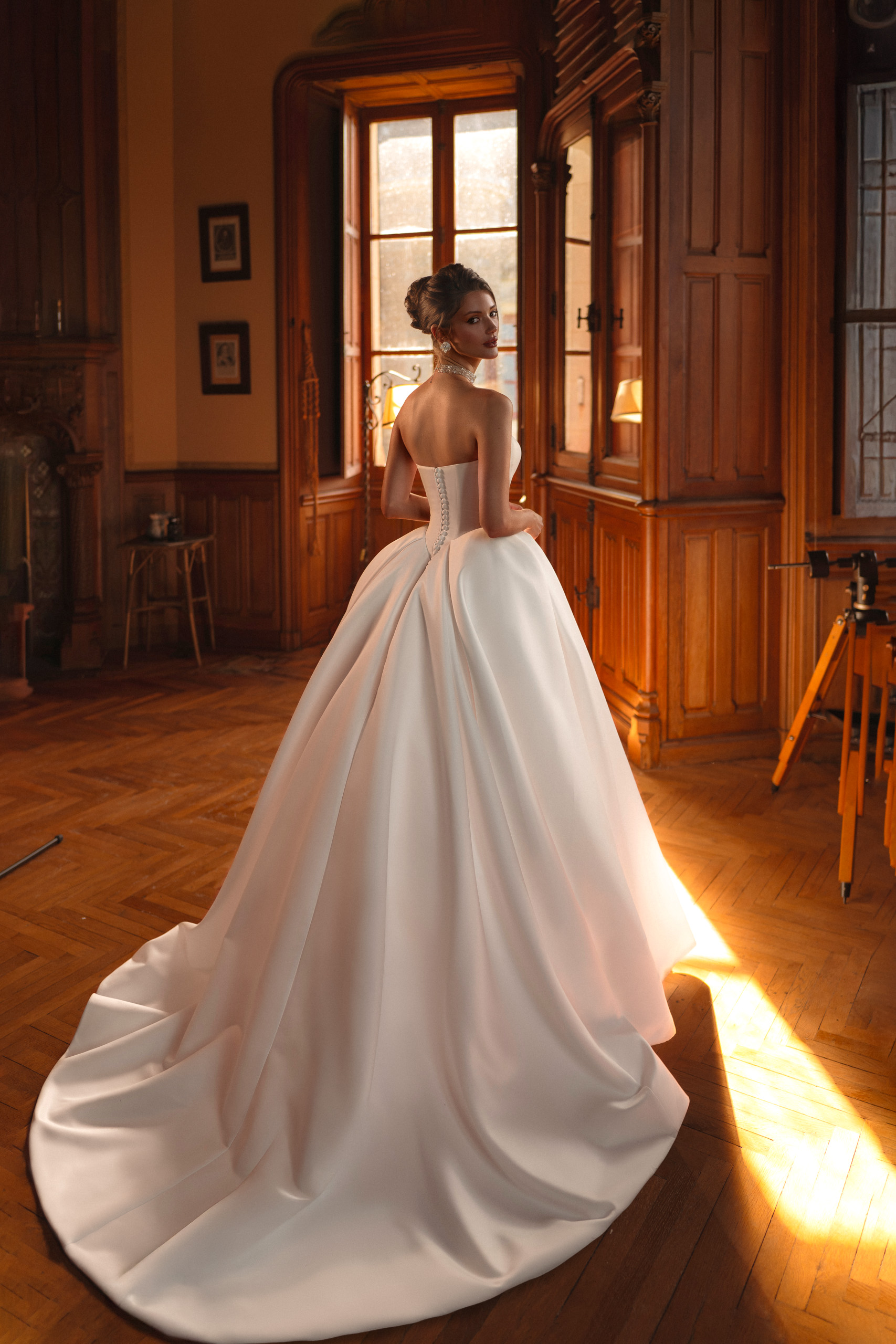 The Teffie Simple dress is elegance in a pure and minimalistic way. This ball gown made of noble satin has a graceful moon shaped bodice and a fluffy skirt with an unusual cut, creating a perfect princess silhouette and reminiscent of historical ball gowns. Due to the absence of embellishments, the emphasis is entirely on the perfect cut, the architectural precision of the lines, and the luxurious texture of the fabric. The dress is fastened with a zipper, has internal lacing and a buttoned back. The Teffie Simple dress is an ideal choice for modern classic weddings, ceremonies in bright palace interiors, or celebrations in modern locations with minimalist design. This look fascinates with its restraint and sophistication.
